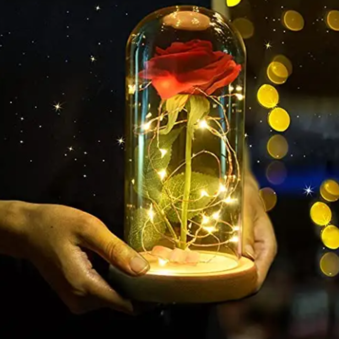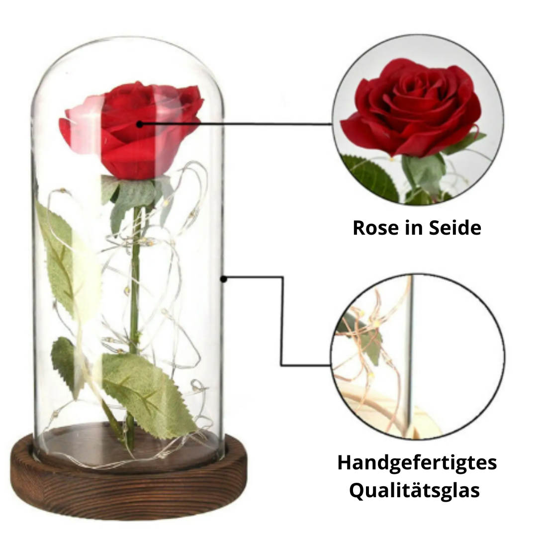 Im Inneren leuchtet eine verzauberte Rose in einem warmen, einhüllenden Licht, das jede Nacht zu einem märchenhaften Moment macht.